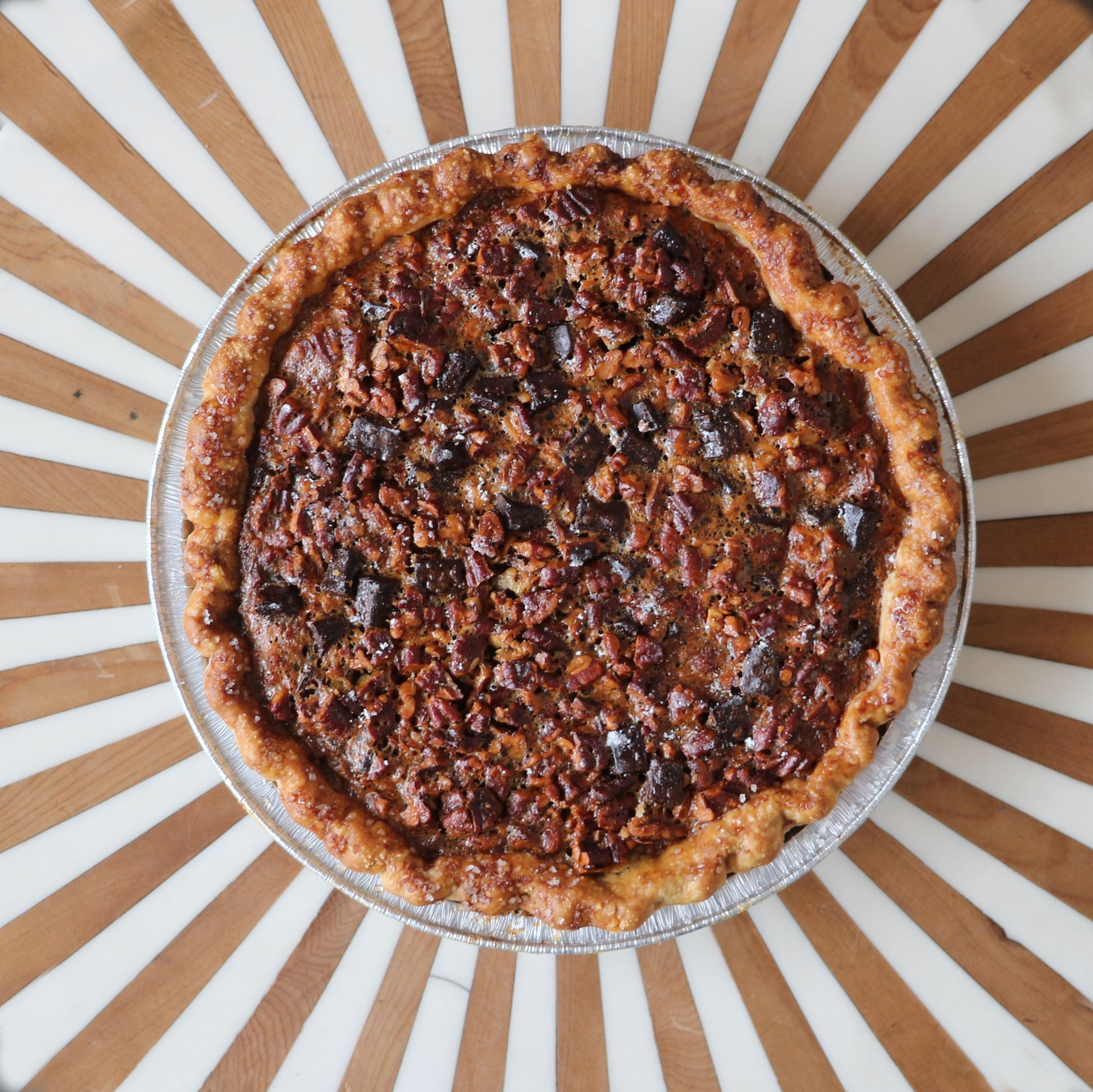 Gooey and decadent chocolate pecan filling infused with bourbon. All alcohol is cooked off, so this pie is fit for the whole family. Our 9" pie will comfortably serve 8 guests.