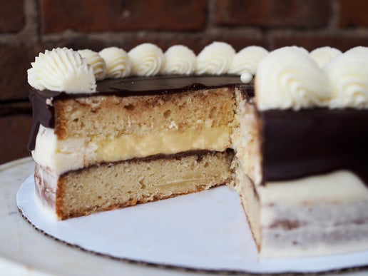 A creamy, decadent cake that brings a touch of elegance to the table. Two layers of vanilla sponge cake, vanilla pastry cream, rich chocolate ganache and a touch of vanilla buttercream to hold it all together. This cake is 9" in diameter, feeding up to 20 guests.